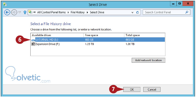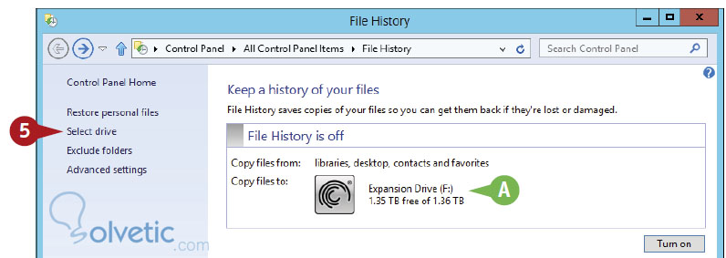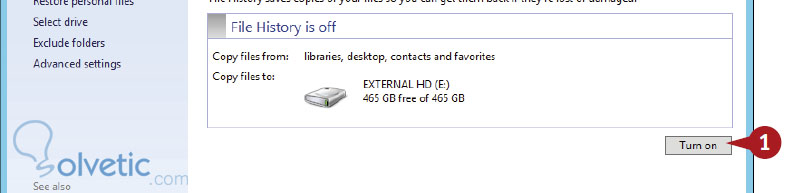 Después de haber seleccionado el dispositivo hacemos click en Turn on. Windows 8 empezará a guardar copias de las versiones de tus archivos en el dispositivo seleccionado. Sí por algún motivo necesitamos desconectar el dispositivo en el cual estamos realizando los respaldos con File History, realizamos los pasos del 1 al 4 y hacemos click en Turn off.