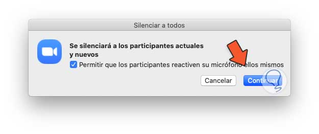 Si deseamos que todos los micrófonos sean silenciados debemos dar clic sobre la opción “Silenciar a todos” en la parte inferior y se desplegará la siguiente advertencia. Confirmamos dando clic en “Continuar” y es posible que cada usuario administre su micrófono si dejamos activa la casilla “Permitir que los participantes reactiven su micrófono ellos mismos”.