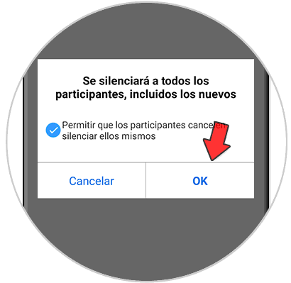 Veremos el siguiente mensaje. Damos clic en OK para confirmar la acción y posteriormente si deseamos activar el audio pulsamos en la opción “Dejar de silenciar a todos”.