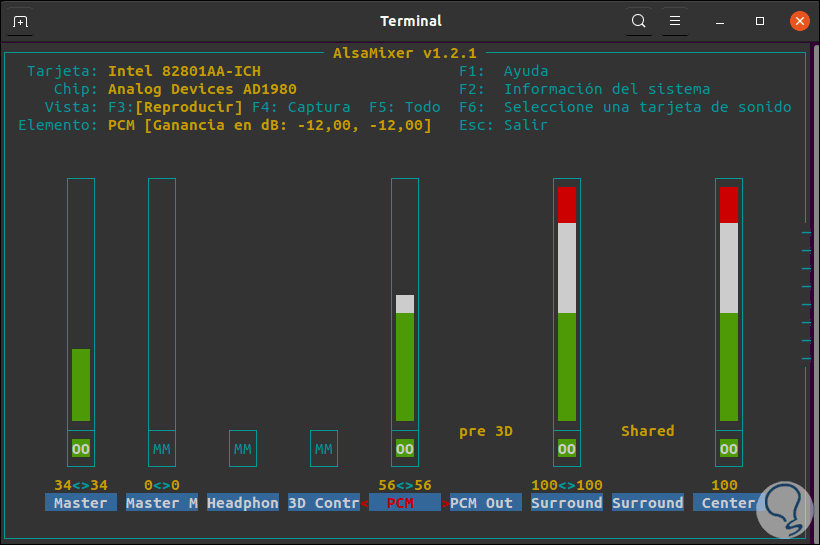 Pulsamos Enter y con las teclas de flecha izquierda y derecha podemos seleccionar un control de volumen según sea necesario (ubicados en la parte inferior) y con las flechas arriba y hacia abajo será posible aumentar o disminuir los niveles de volumen para cada control seleccionado. Si un control del mezclador está en silencio veremos la leyenda "MM" y los demás estarán por defecto en 100%, por ejemplo, PCM podemos usar la flecha bajo para disminuir su nivel a 56%: