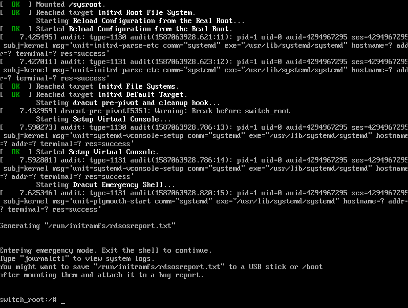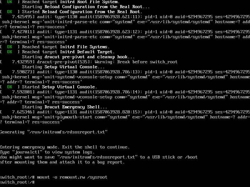Este texto “rhgb quiet” lo reemplazamos con el texto “rd.break enforcing=0”: