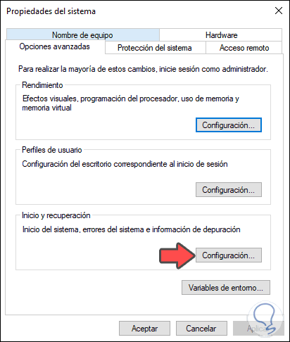 Damos clic en la línea “Configuración avanzada del sistema” y en la ventana desplegada vamos a la pestaña “Opciones avanzadas” y allí damos clic en el botón “Configuración” en el campo “Inicio y recuperación”: