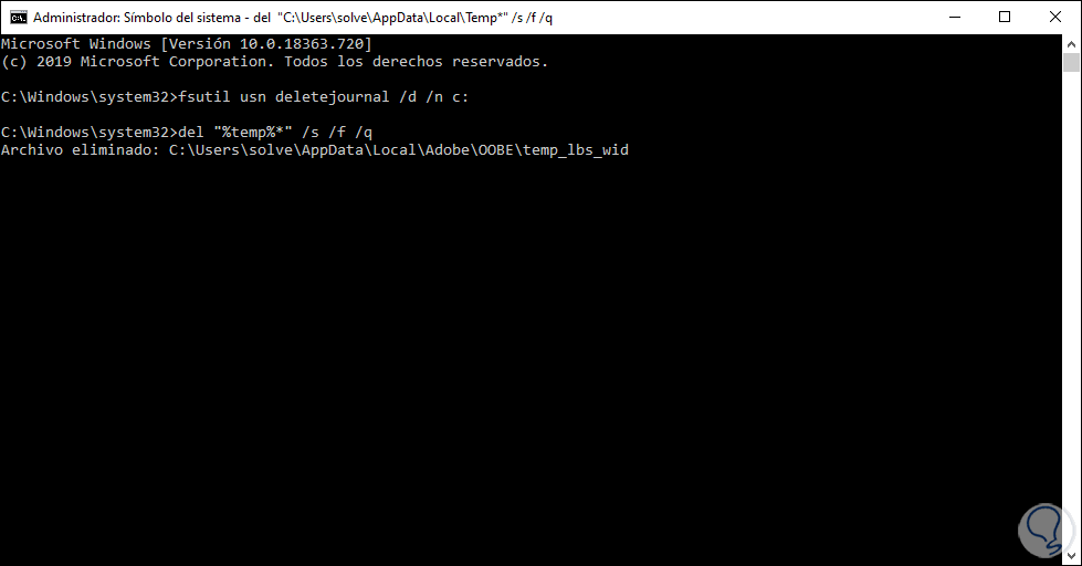 Tenemos la oportunidad de borrar estos archivos directamente desde la consola del símbolo del sistema. Para esto accedemos a la consola del símbolo del sistema como administradores y allí ejecutamos en su orden cada uno de los siguientes comandos: