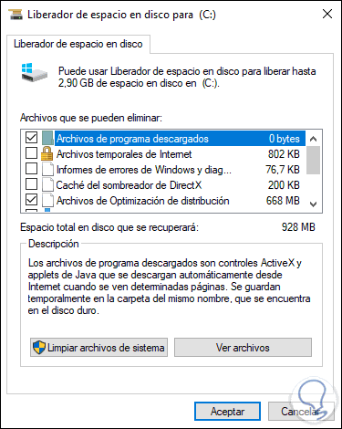 Damos clic en "Archivos temporales" y luego debemos buscar si está disponible "Archivos de volcado de memoria". Recordemos que solo estará disponible si el equipo ha sufrido bloqueos con BSOD.