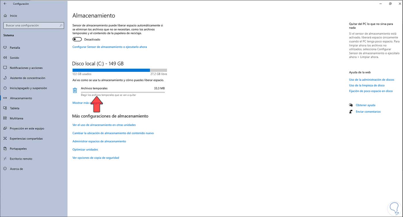 Allí vamos a “Sistema - Almacenamiento" donde veremos lo siguiente: