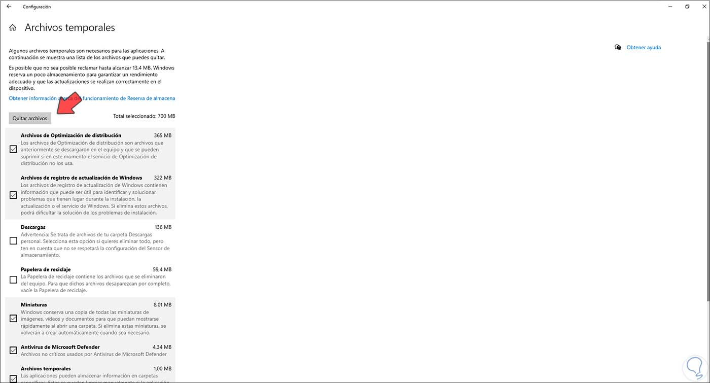 En caso de que exista, debemos activar la casilla correspondiente y dar clic en “Quitar archivos”.