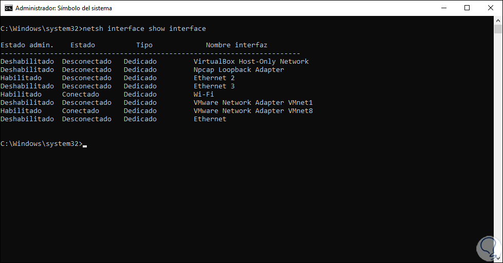El primer paso será visualizar los adaptadores de red en el equipo, para ello accedemos al símbolo del sistema como administradores y ejecutamos lo siguiente: