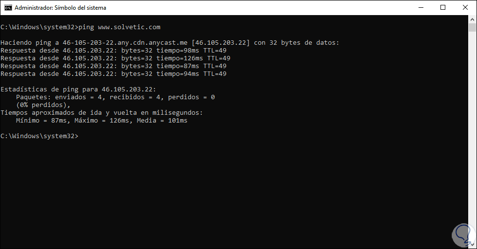 Si vamos al símbolo del sistema y ejecutamos lo siguiente veremos que la red Wi-Fi esta activa de nuevo y el ping responde de la forma esperada:
