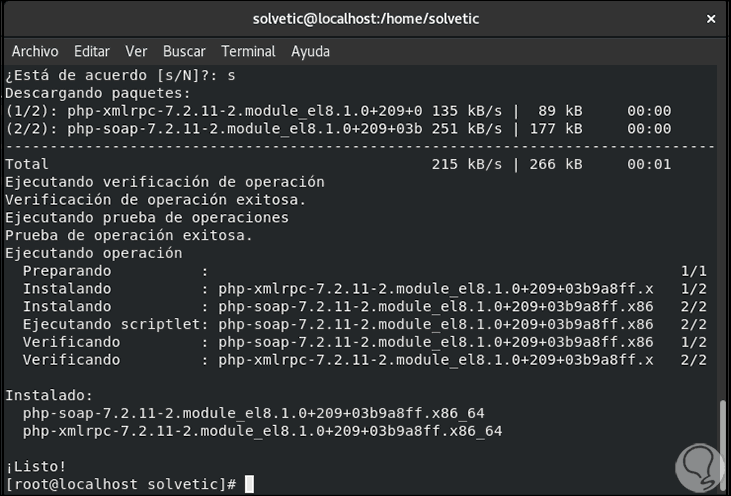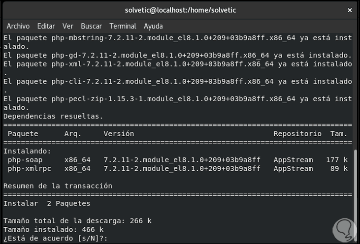 Ingresamos la letra “s” para confirmar la descarga e instalación de LEMP en CentOS 8.