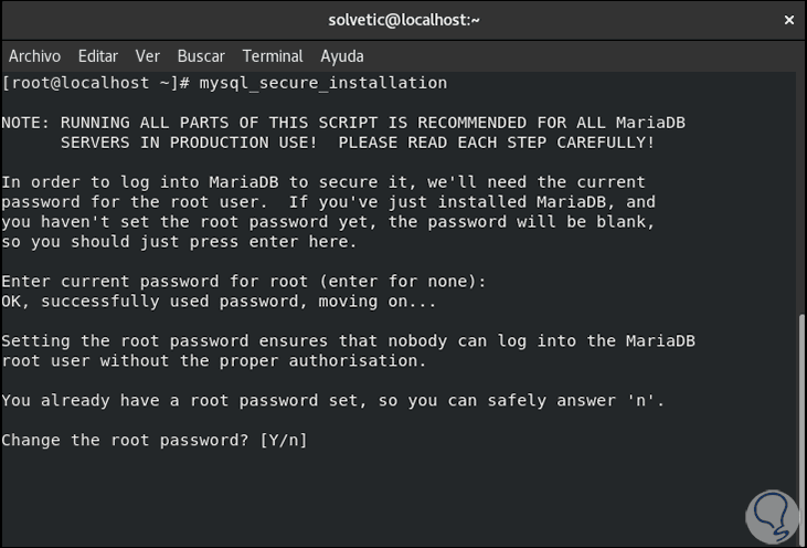 El siguiente paso será asegurar la instalación de MySQL (por defecto es insegura), para ello vamos a ejecutar el siguiente comando. Allí debemos completar cada una de las preguntas desplegadas como lo son el cambio de contraseña de root, borrar bases de datos temporales y más.