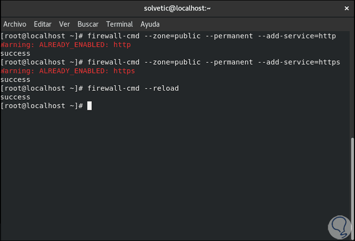 A continuación, vamos a habilitar los protocolos HTTP y HTTPS para el acceso externo a través del Firewall, ejecutamos lo siguiente: