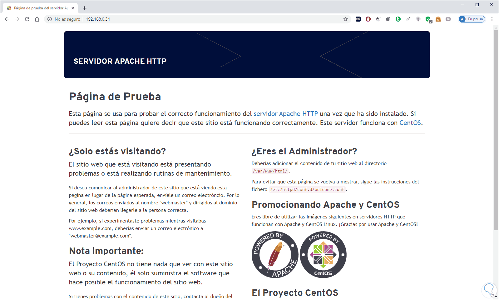 Una vez realizado esto accedemos desde un navegador e ingresamos la IP del servidor para acceder a la configuración de Apache: