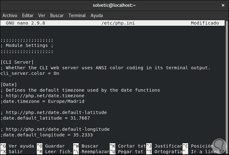 Allí vamos a la línea “;date.timezone” y establecemos la zona horaria actual. Guardamos los cambios y salimos del editor.