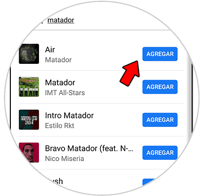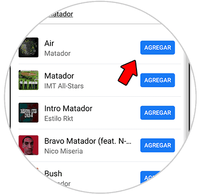 Para agregar la canción deseada pulsando en el botón “Agregar”, luego dicha canción será añadida: