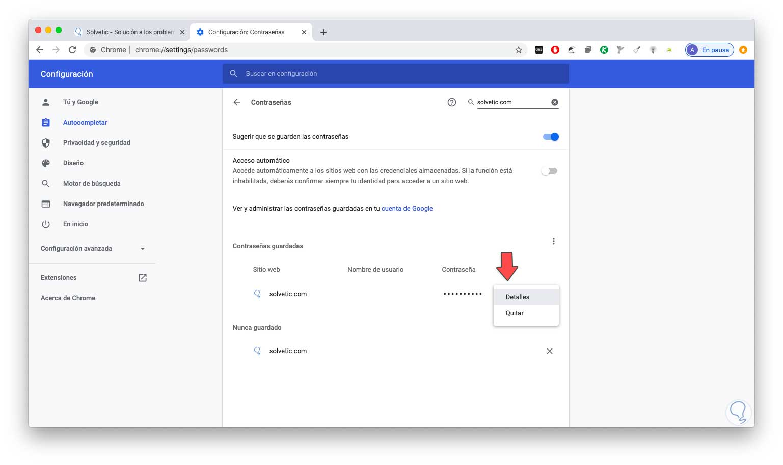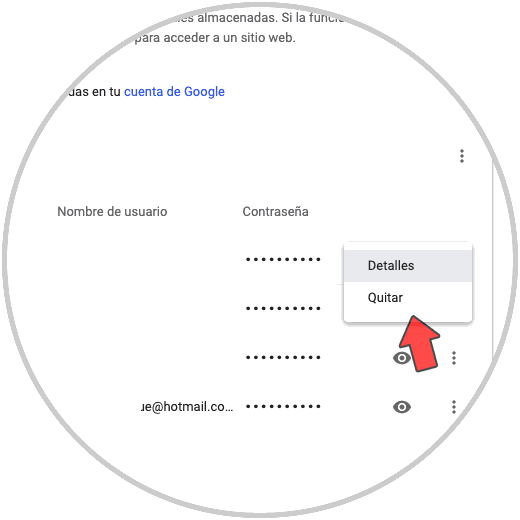 Buscamos el sitio web donde esta guardada la contraseña y pulsamos sobre el menú lateral y esta vez seleccionamos “Detalles”: