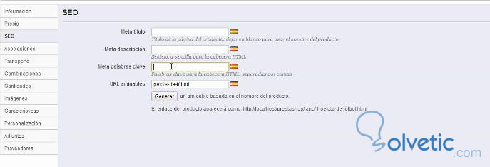 Para esta operación se dispone dentro de la ficha de productos una opción llamada SEO. Al ingresar en un producto se va directamente a la pestaña SEO para poder configurar el titulo, la descripción y las palabras claves.