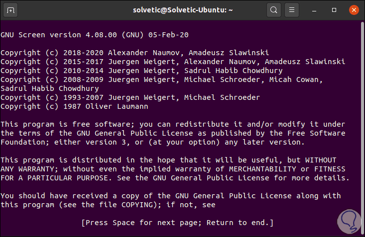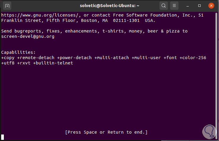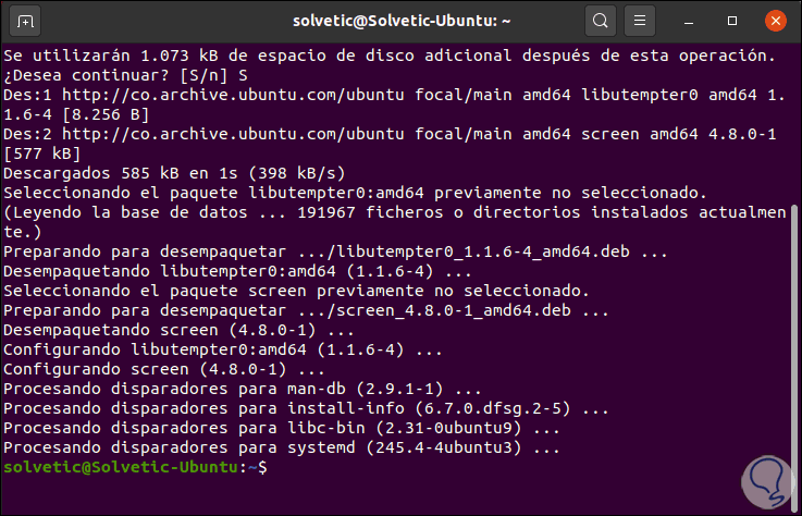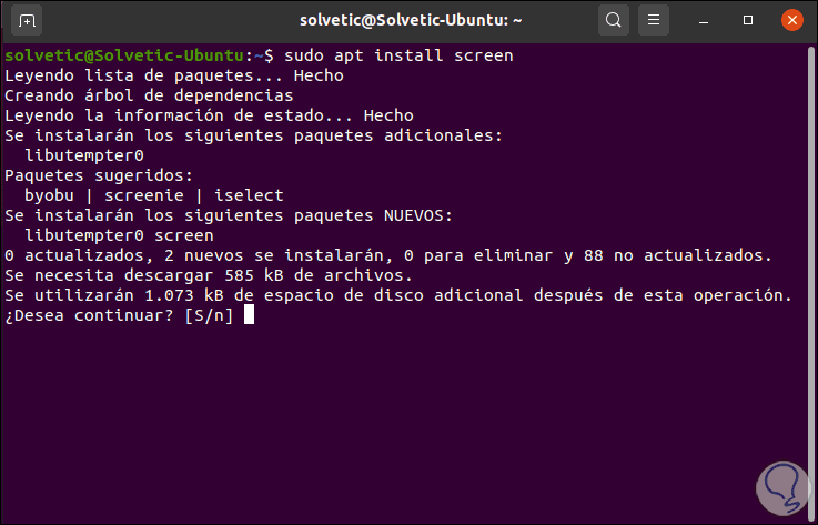 Ingresamos la letra S para confirmar la descarga e instalación de Screen: