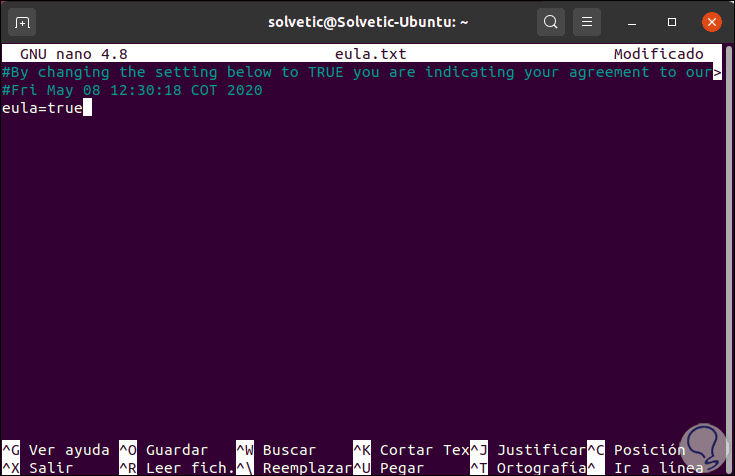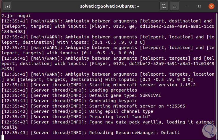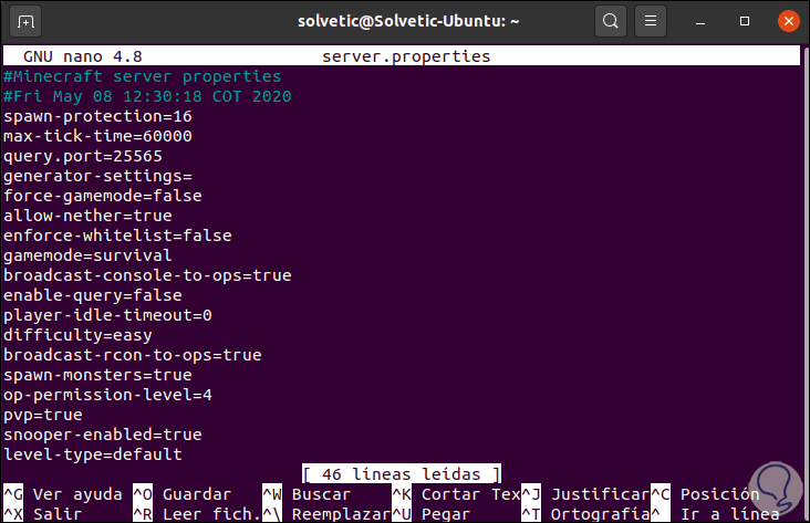 Guardamos los cambios y de nuevo ejecutamos el comando de configuración de Minecraft: