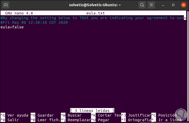 En primer lugar, vamos a acceder al archivo EULA ejecutando: