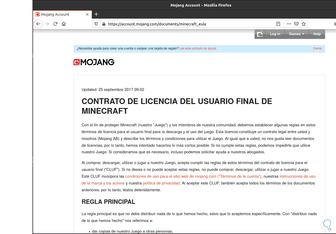 Allí vamos a la línea superior e ingresamos la URL de EULA de Minecraft: