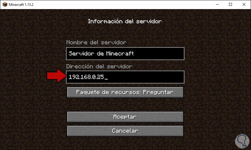 Ahora ingresamos la dirección IP del servidor de Minecraft en Ubuntu 20.04: