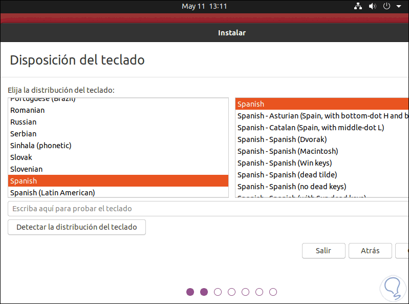 En este caso damos clic sobre “Instalar Ubuntu” y a continuación definimos el idioma del teclado a usar: