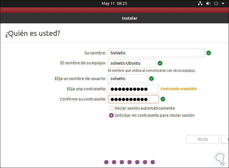 En la siguiente ventana ingresaremos los datos de usuario administrador y su contraseña: