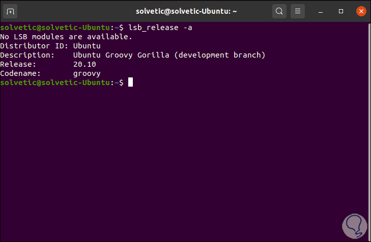 Podemos acceder a la terminal y ejecutar “lsb_release -a” para verificar que se ha instalado Ubuntu 20.10 de forma correcta: