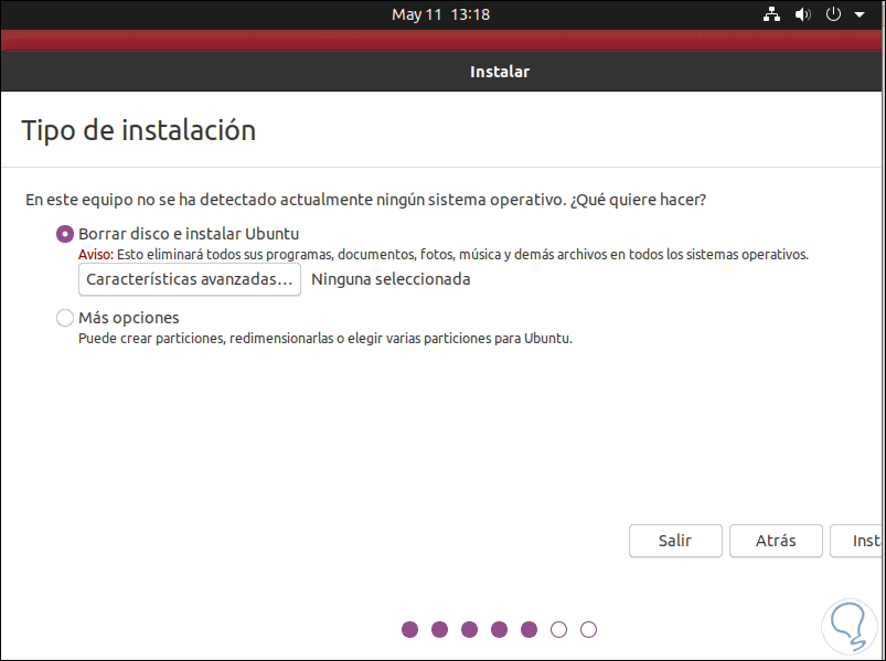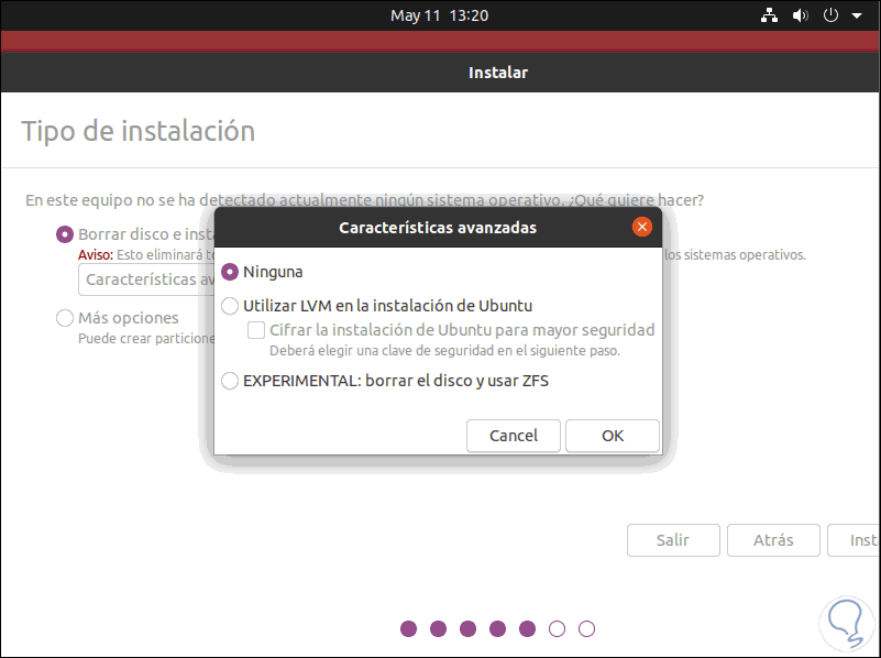 A continuación, llegaremos a la sección del disco duro donde veremos lo siguiente. Allí podemos dejar la opción por defecto para que Ubuntu 20.10 administre la estructura del disco o bien podemos activar la casilla “Mas opciones” para hacer este proceso de forma manual. Además disponemos del botón “Características avanzadas” el cual nos da la oportunidad de usar ZFS para este proceso: