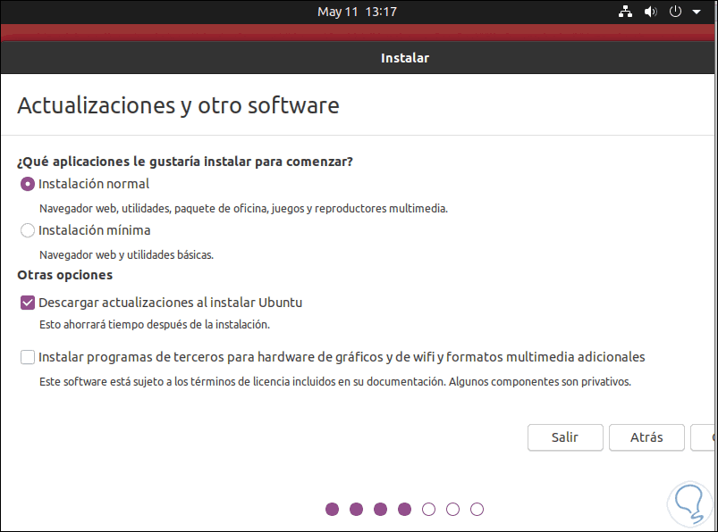 En la siguiente ventana definimos el tipo de instalación a usar, puede ser normal o mínima, así como la posibilidad de descargar las actualizaciones disponibles durante este proceso: