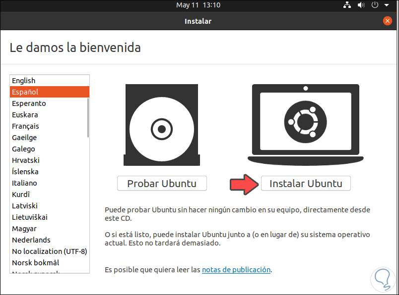 Iniciamos el proceso de instalación de Ubuntu 20.10 dando clic en Instalar: