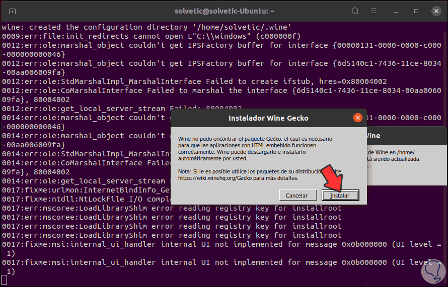 Damos clic sobre el botón “Instalar” para descargar e instalar esta función de Wine en Ubuntu 20.10: