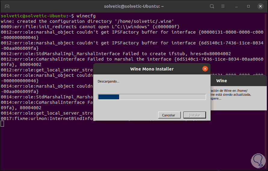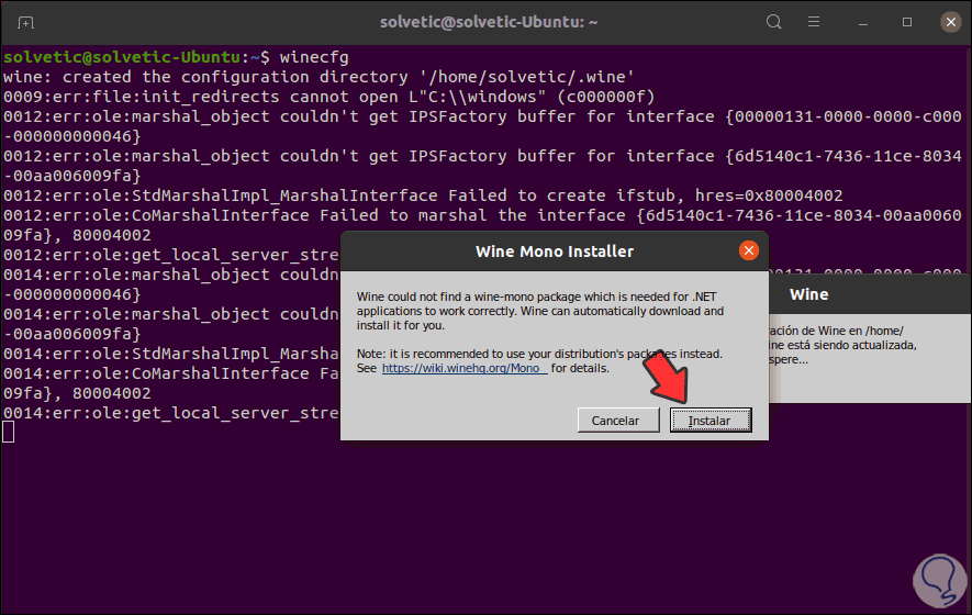 Es momento de configurar Wine en el sistema, para ello ejecutamos el siguiente comando en la terminal: