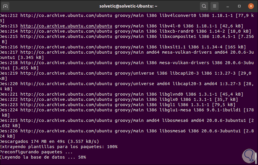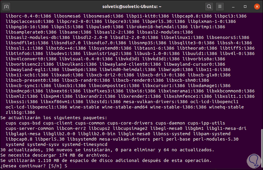 Ingresamos la letra S para confirmar la descarga e instalación de Wine (en este caso la versión estable).