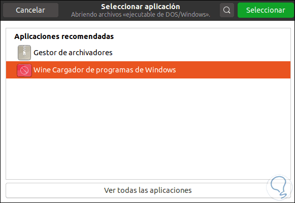 En la ventana emergente seleccionamos “Wine Cargador de programas de Windows”