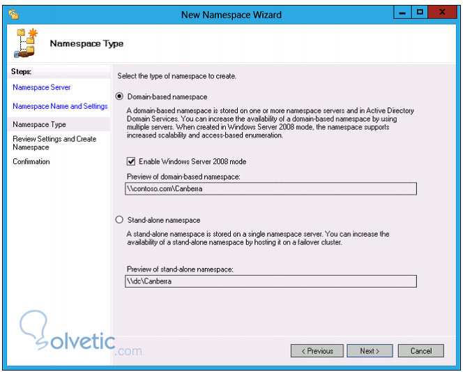 Existen dos tipos de espacios de nombres que podemos crear en un servidor con Windows Server 2012, estos son: