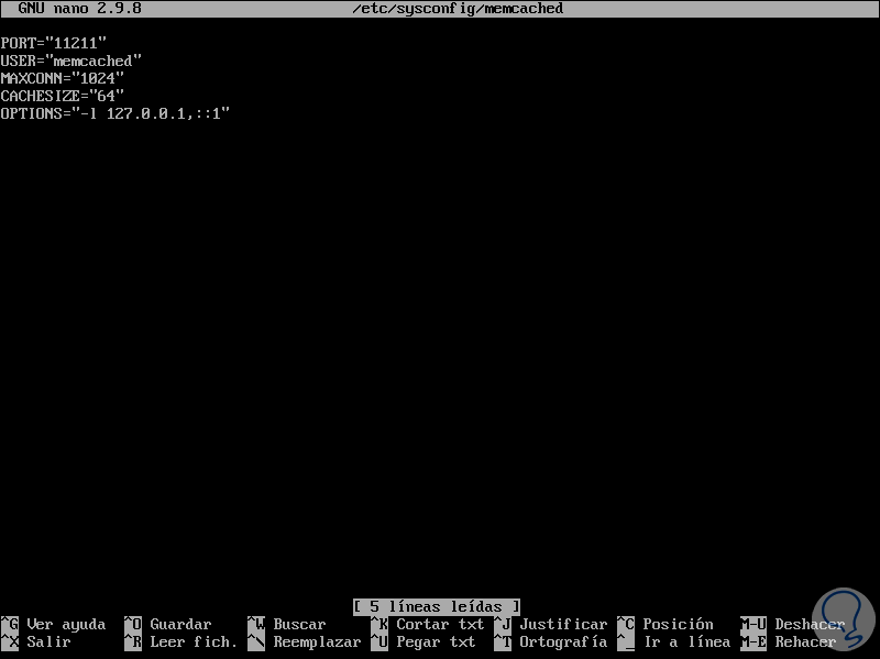 La configuración de Memcached está disponible en el archivo /etc/sysconfig/memcached y dispone de diferentes variables a usar.