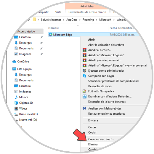 Damos clic en Aceptar y en la ventana desplegada veremos si allí esta el acceso directo a Edge, de ser así procedemos a su eliminación:
