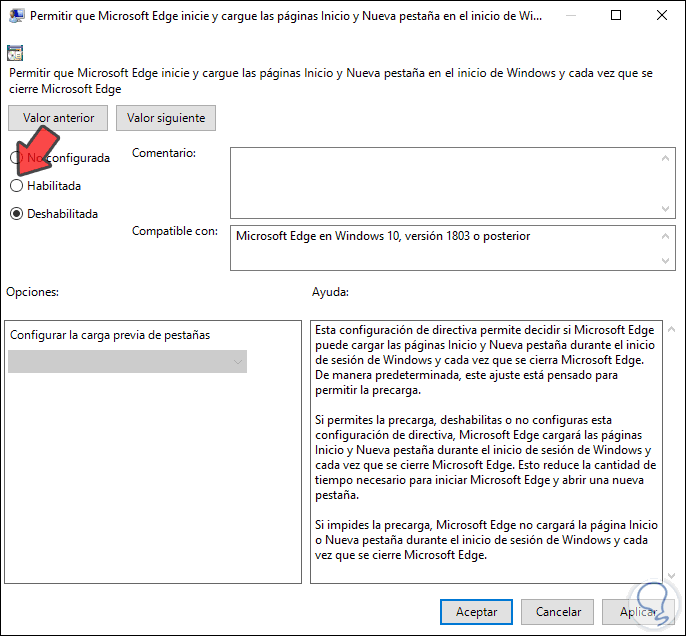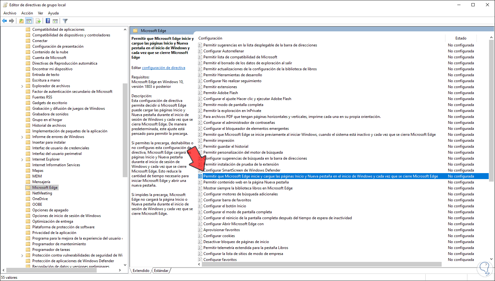 En el panel lateral ubicaremos la política llamada “Permitir que Microsoft Edge inicie y cargue las páginas Inicio y Nueva pestaña en el inicio de Windows y cada vez que cierre Microsoft Edge”: