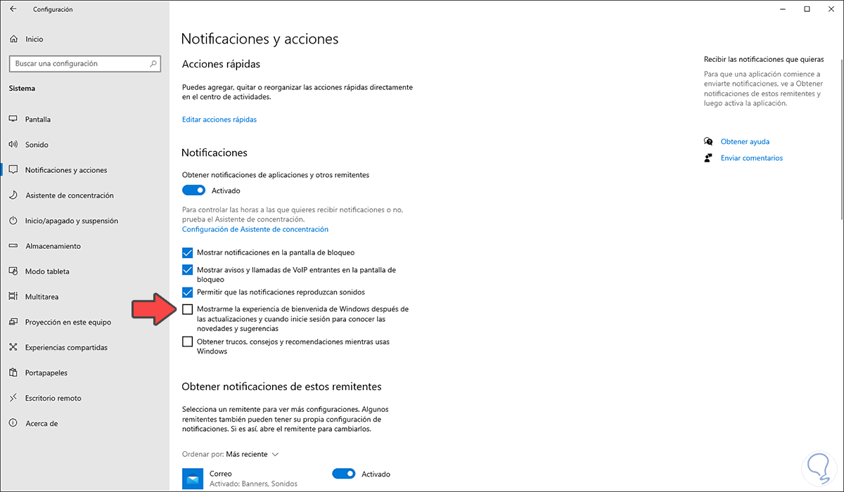 Allí vamos a Sistema – Notificaciones y acciones y allí desactivamos la casilla “Mostrarme la experiencia de bienvenida de Windows después de las actualizaciones y cuando inicie sesión para conocer las novedades y sugerencias”: