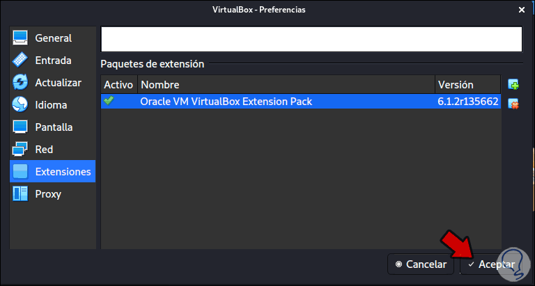 sudo vboxmanage extpack install Oracle_VM_VirtualBox_Extension_Pack-6.1.2.vbox-extpackEsto desplegará los términos de licencia de las extensiones: