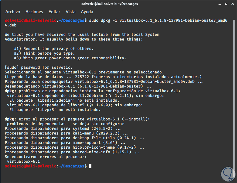 Esto se debe a la falta de algunas dependencias, para ello vamos a descargarlas con la siguiente orden: