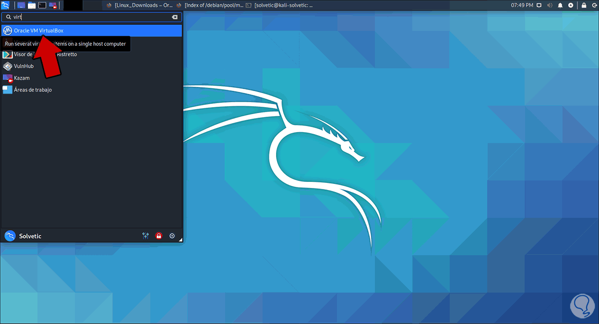 Ahora será posible lanzar VirtualBox desde el menú de Kali Linux: