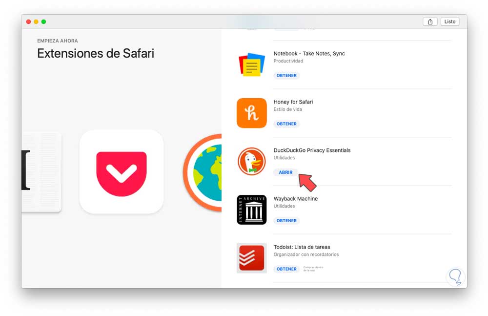 Para el caso de Safari debemos acceder al navegador e ir al menú “Safari – Extensiones de Safari”: