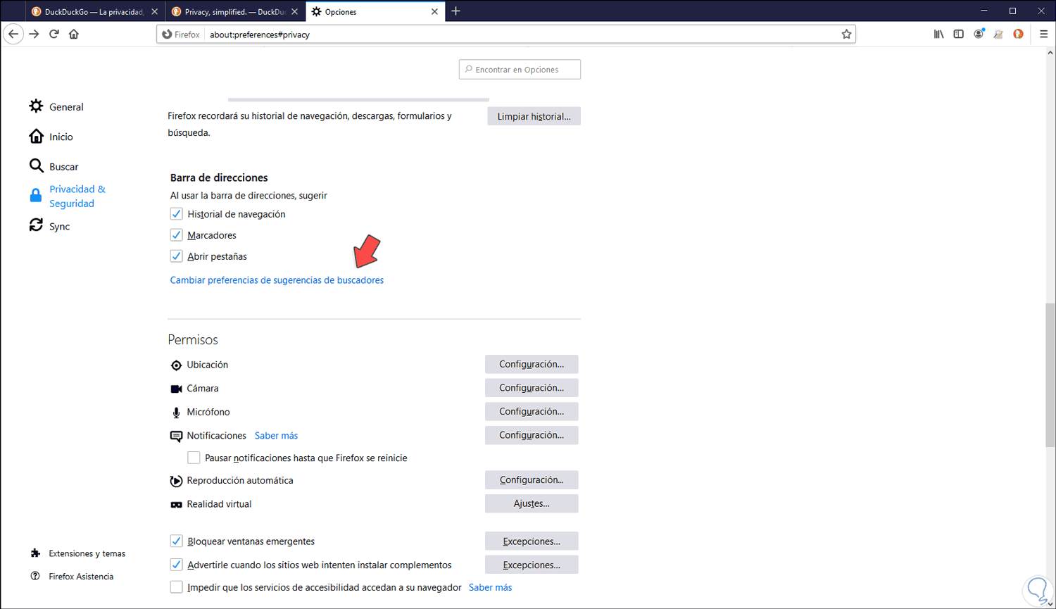 Damos clic en la línea “Cambiar preferencias de sugerencias de buscadores” y allí validamos que DuckDuckGo sea el buscador por defecto:
