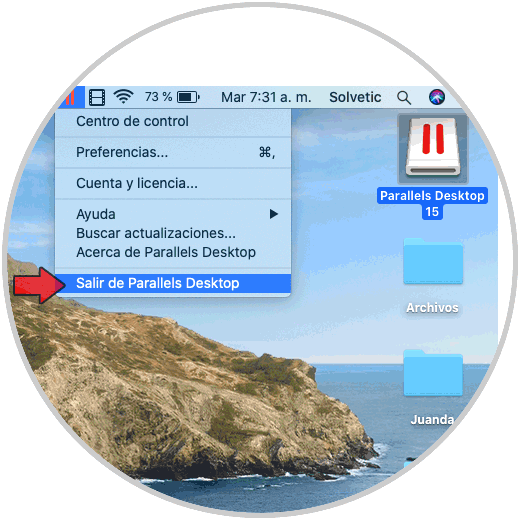 En primer lugar, debemos salir de la aplicación si la tenemos abierta, para ello damos clic sobre el ícono de la app y seleccionamos “Salir de Parallels Desktop”: