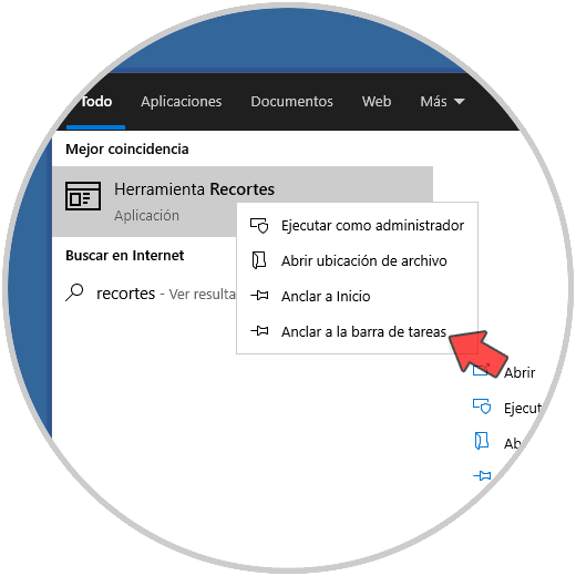 Para ello simplemente debemos ingresar el término “recortes” en la barra de búsqueda del menú Inicio y allí seleccionar la aplicación desplegada: