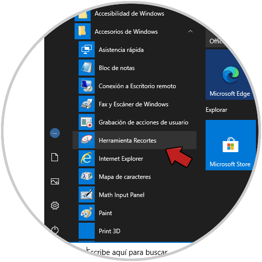 Uno de los métodos más usados es desde el menú Inicio, para ello vamos a la sección “Accesorios de Windows” y dar clic sobre “Herramienta Recortes”: