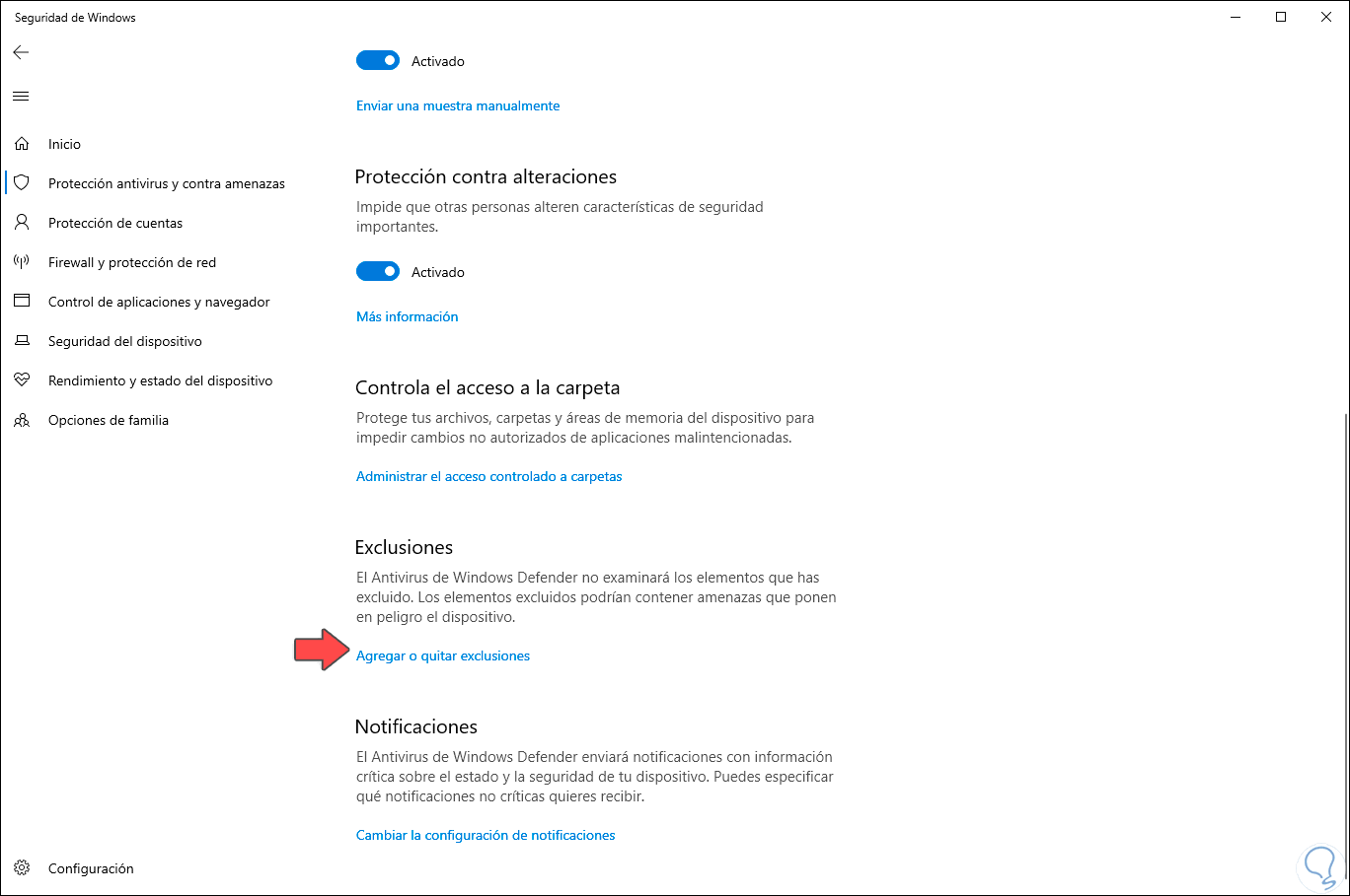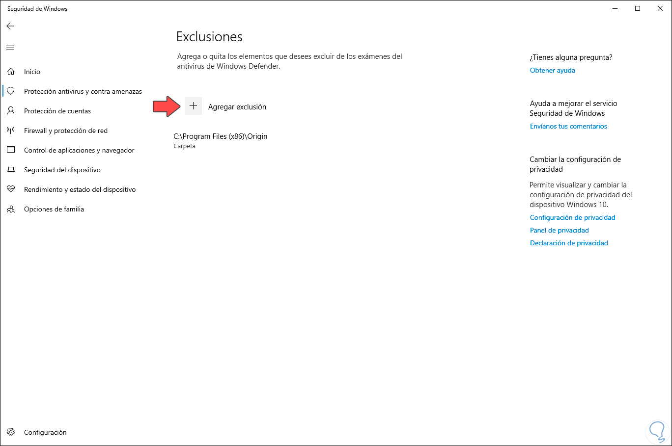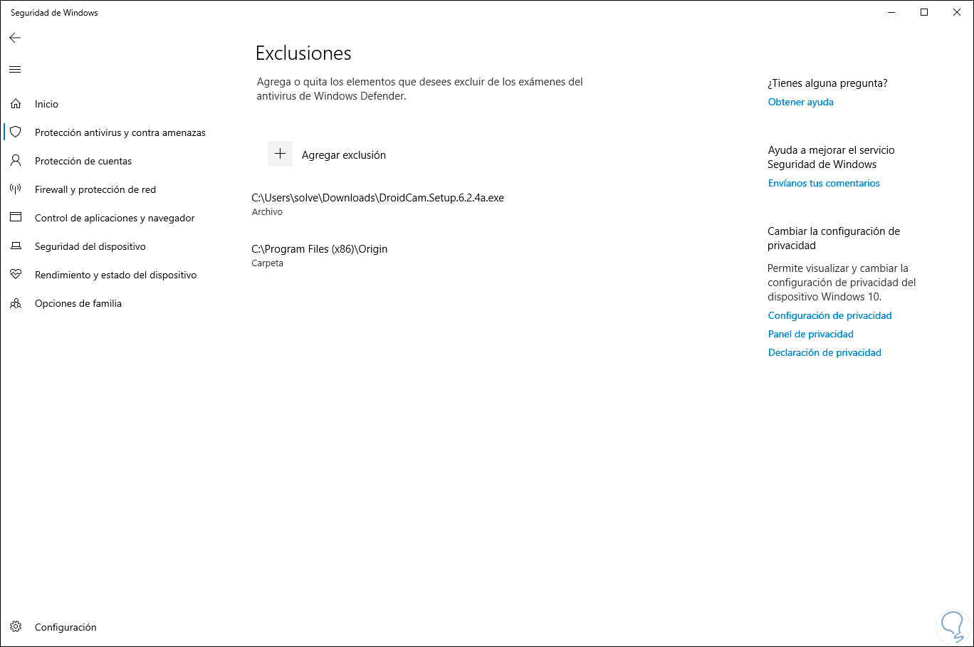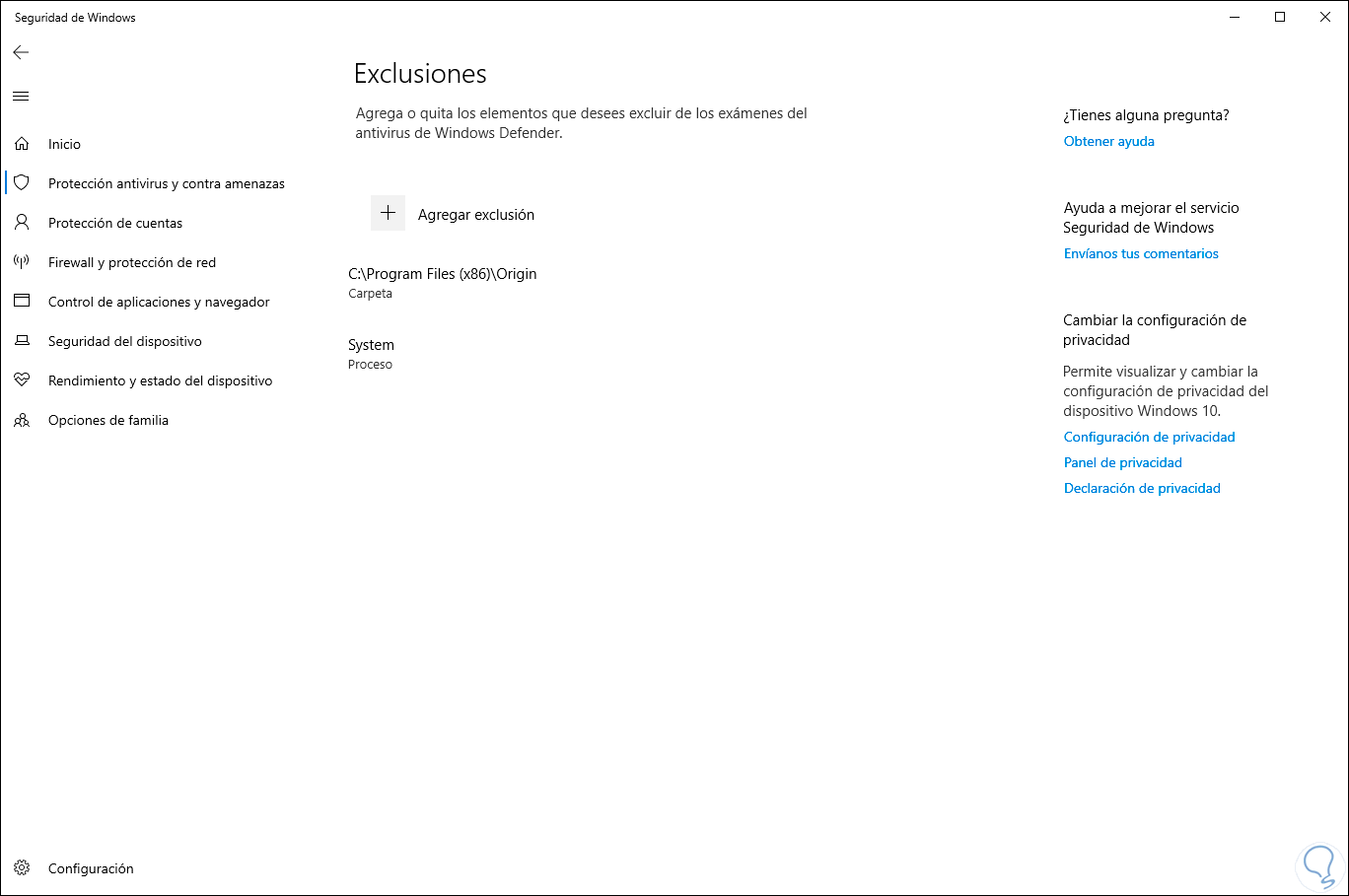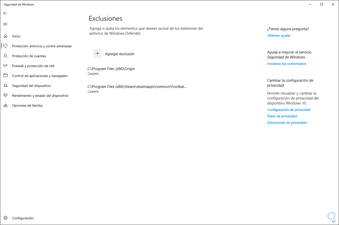 Como podemos ver, es simple el agregar exclusiones Windows Defender para evitar que un determinado objeto pase a ser reconocido como amenaza cuando no lo es.