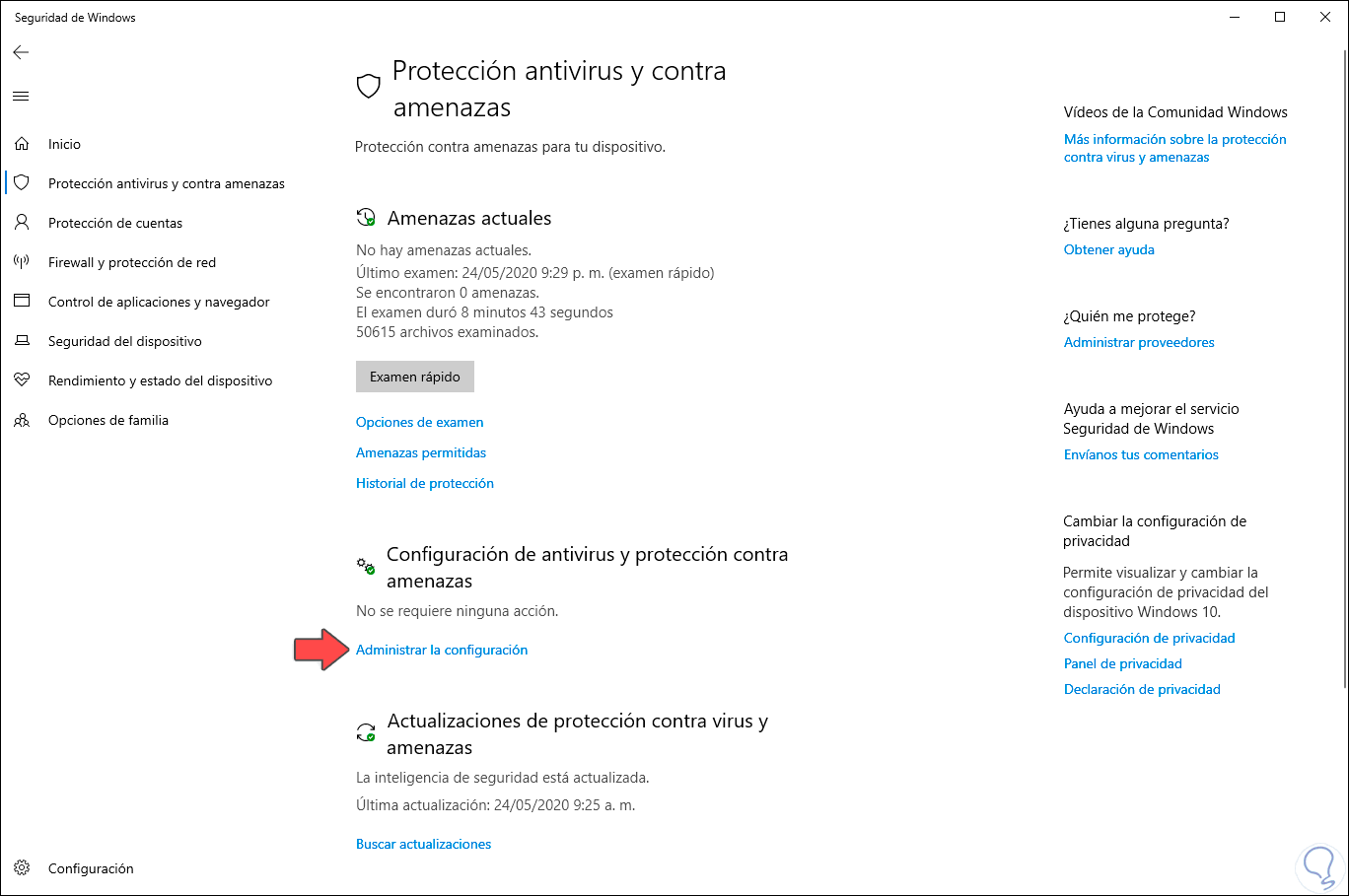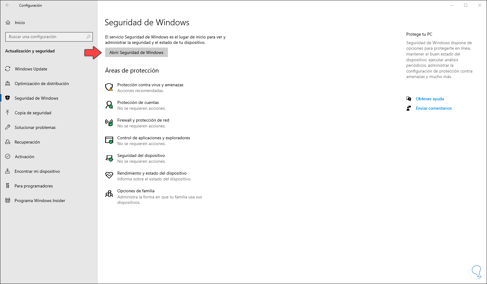 Damos clic en el botón “Abrir Seguridad de Windows” y en la nueva ventana desplegada vamos a la sección “Protección antivirus y contra amenazas”: